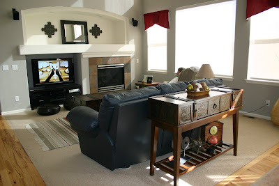 This is what our living room looks like right now. We still haven't gotten the recessed area aboved the tv painted just yet but that should be happening soon. I need to get more knick knacks to go up there too. Oops, I just noticed that the couch still has those pads underneath it to make it easier to move. Ugh, those have got to go, lol.